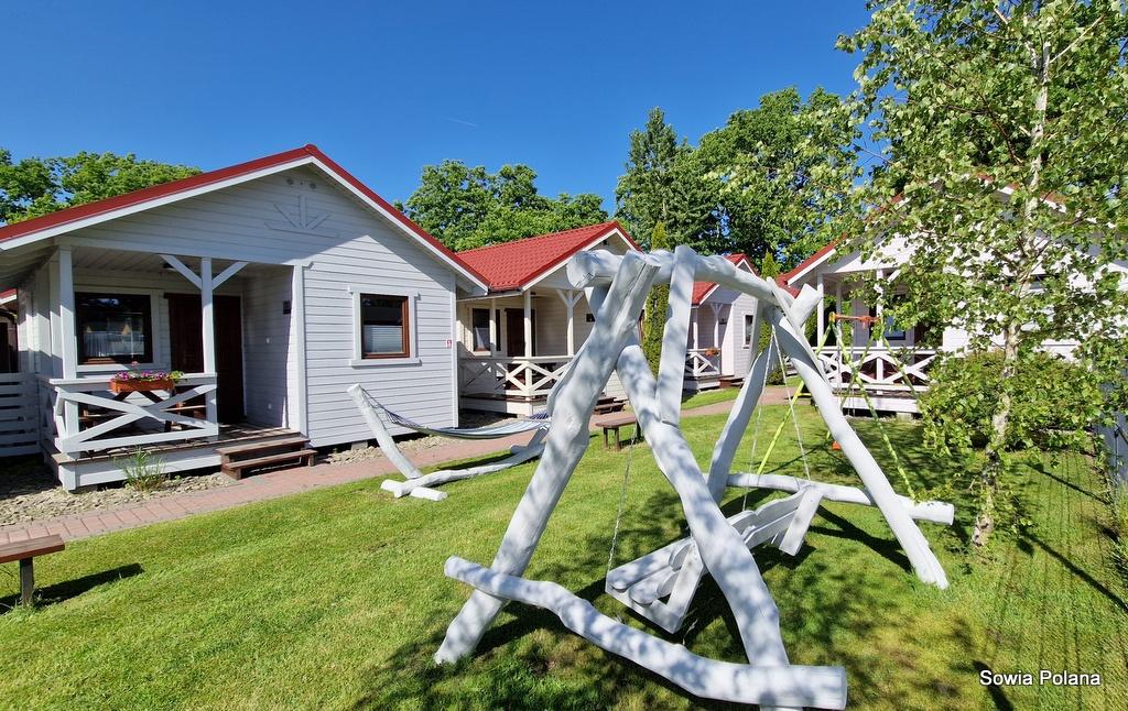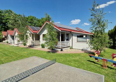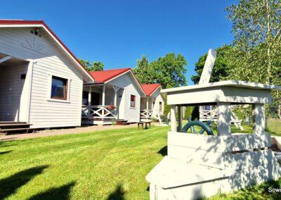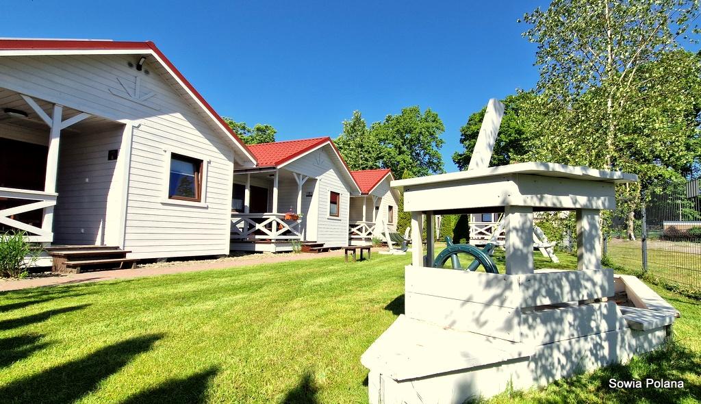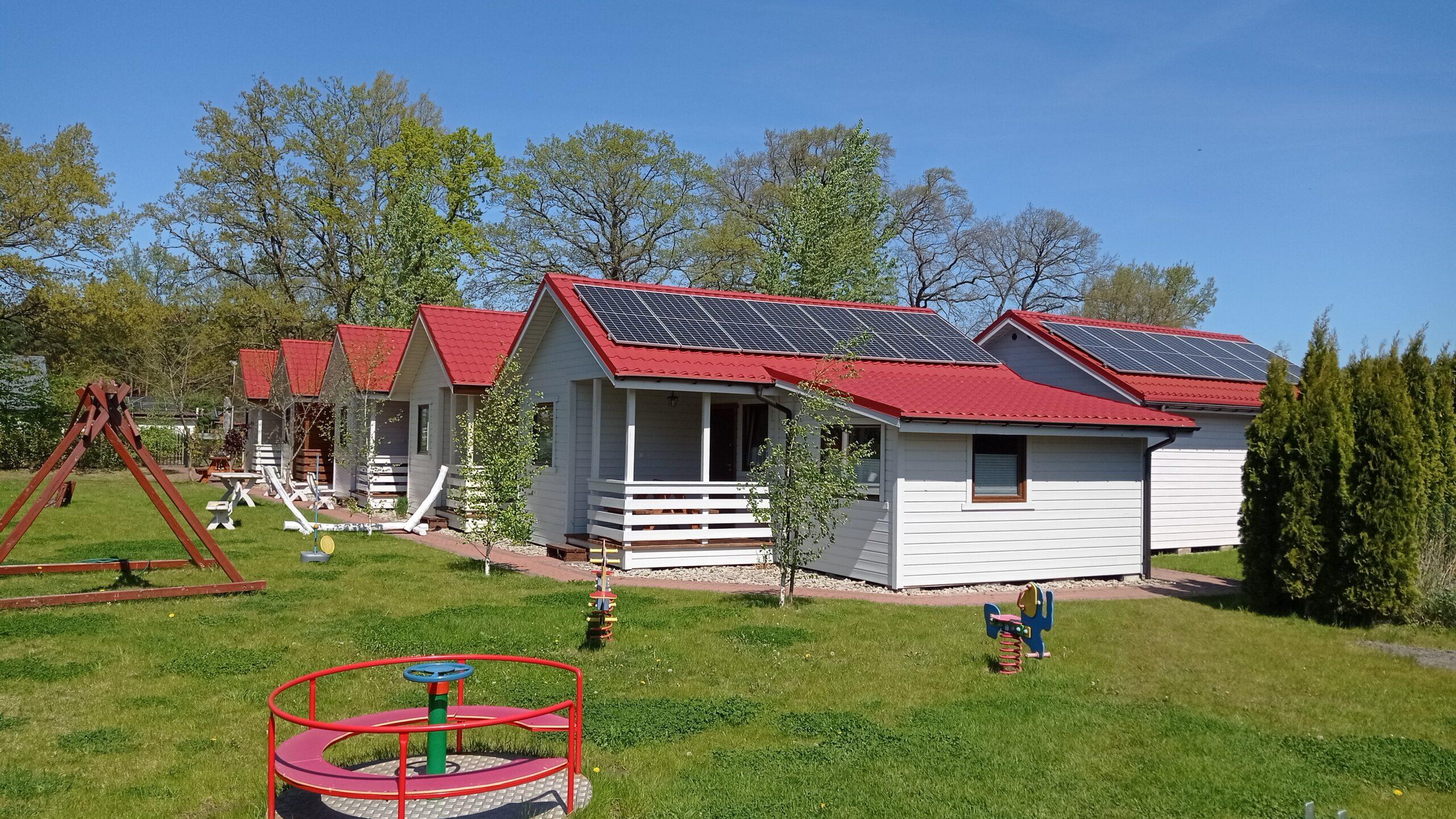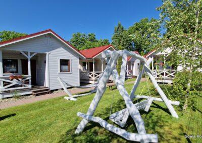 W swojej ofercie posiadamy nowe domki, każdy o powierzchni 35 m2 z zadaszonym tarasem. W każdym domku przeznaczonym od 4 do 5 osób znajdują się dwie sypialnie, salon z jadalnią i aneksem kuchennym oraz wykafelkowana łazienka.